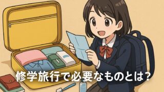 旅行一般 修学旅行で必要なものとは?中学生・高校生・小学生向け持ち物術! こちらでは、中学生・高校生・小学生といった学年別に修学旅行で必要な持ち物、男子・女子で異なる持ち物や女子力を高めるアイテムについてまとめました。また、バッグの選び方や荷物の詰め方、修学旅行をより楽しくするための便利グッズやおすすめアイテムも紹介! 旅行一般