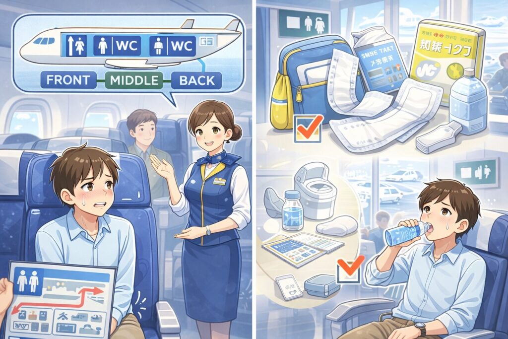 飛行機に乗る前から「トイレが我慢できなかったらどうしよう…」という不安を抱えている方も多いはずです。特に体調が万全でない時や、長距離フライトではその不安が強くなります。そんな時は事前準備が安心につながります。