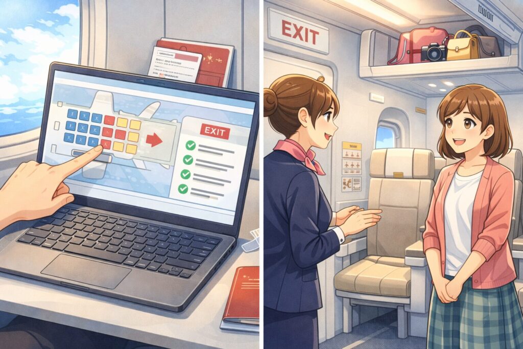 非常口席を事前に指定したい場合は、航空会社の座席指定画面で「EXIT」や「非常口」と表記された位置を探すのがポイントです。座席配置は航空機の型式によって異なるため、フライト前に自分が搭乗する機材のシートマップを確認しておくと安心です。