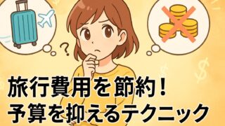 旅行一般 旅行費用を賢く節約!予算を抑えるテクニックとお得な旅のコツ こちらでは、旅行費用を節約する具体的なテクニックについてまとめました。予算を上手に抑え、交通・宿泊・食費など各費用のお得な方法を紹介し、賢く旅行を楽しむヒントをお届けします。あなたの理想の旅を実現するために活用して下さい。 旅行一般