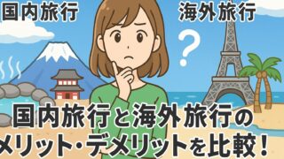 旅行一般 国内旅行と海外旅行のメリット・デメリットを徹底比較!どっちを選ぶ? こちらでは、国内旅行と海外旅行、それぞれのメリット・デメリットを詳しく比較し、どっちを選ぶべきなのかをまとめました。リフレッシュしたい人も異文化を楽しみたい人も旅の目的に合った選び方の目安がわかります。後悔しない旅のヒントを紹介! 旅行一般