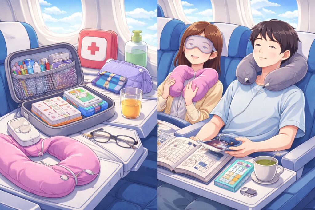 飛行機内では周囲に配慮しつつ、自分の体調を整えながら過ごす工夫が、快適な空の旅につながります。