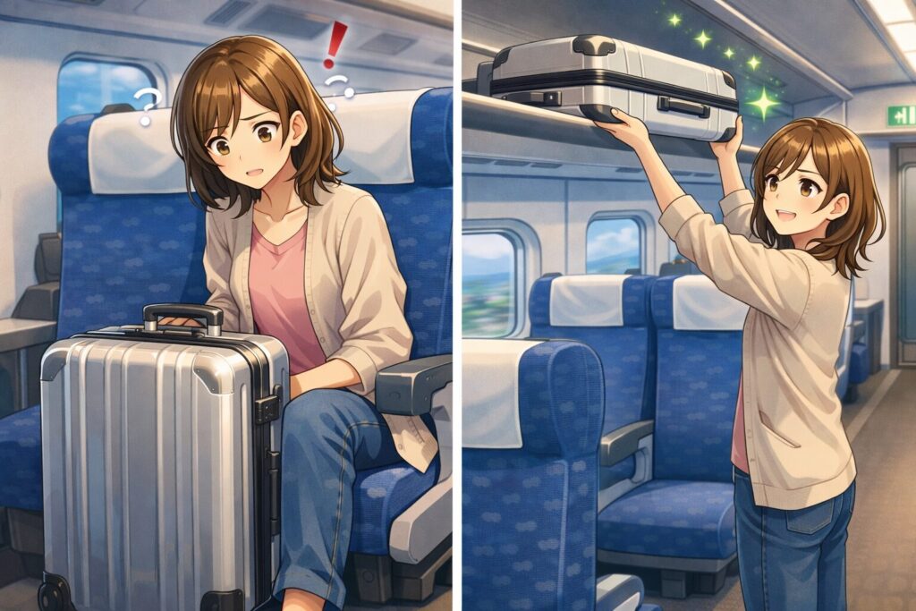 特にキャリーケースのサイズが大きいと、上に置けない場合があったり、あるいは足元スペースを圧迫し、リクライニングやトイレへの移動が不便になることもあります。自由席では置き場が確保できず、他の乗客とトラブルになるケースも。